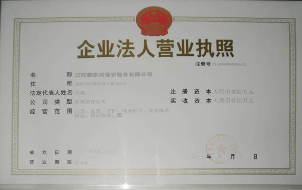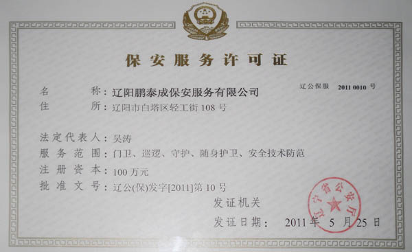遼陽鵬泰成保安服務(wù)有限公司成立于2011年6月,是經(jīng)省公安廳及遼陽市公安局批準(zhǔn),市工商局審批注冊,并在遼陽市公安局指導(dǎo)下成立的正規(guī)集團(tuán)公司。2015年納入公安局“天眼五護(hù)工程”試點(diǎn)單位。